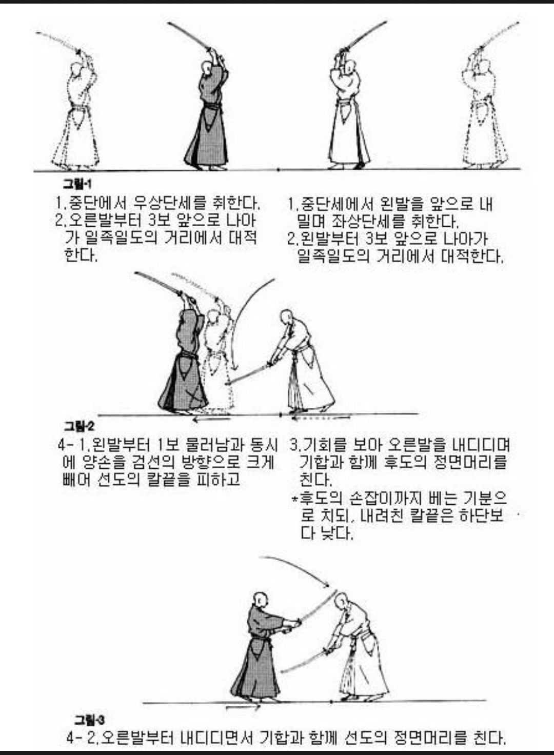 3번 : 정면으로 들어오는 선도의 공격을 끝까지 보면서 우상단에서 왼손을 칼끝 방향(45도)으로 뒤로 빼며 왼발부터 뒤로 1보 물러났다가 앞으로 다시 나아가며 선도의 정면을 칩니다.