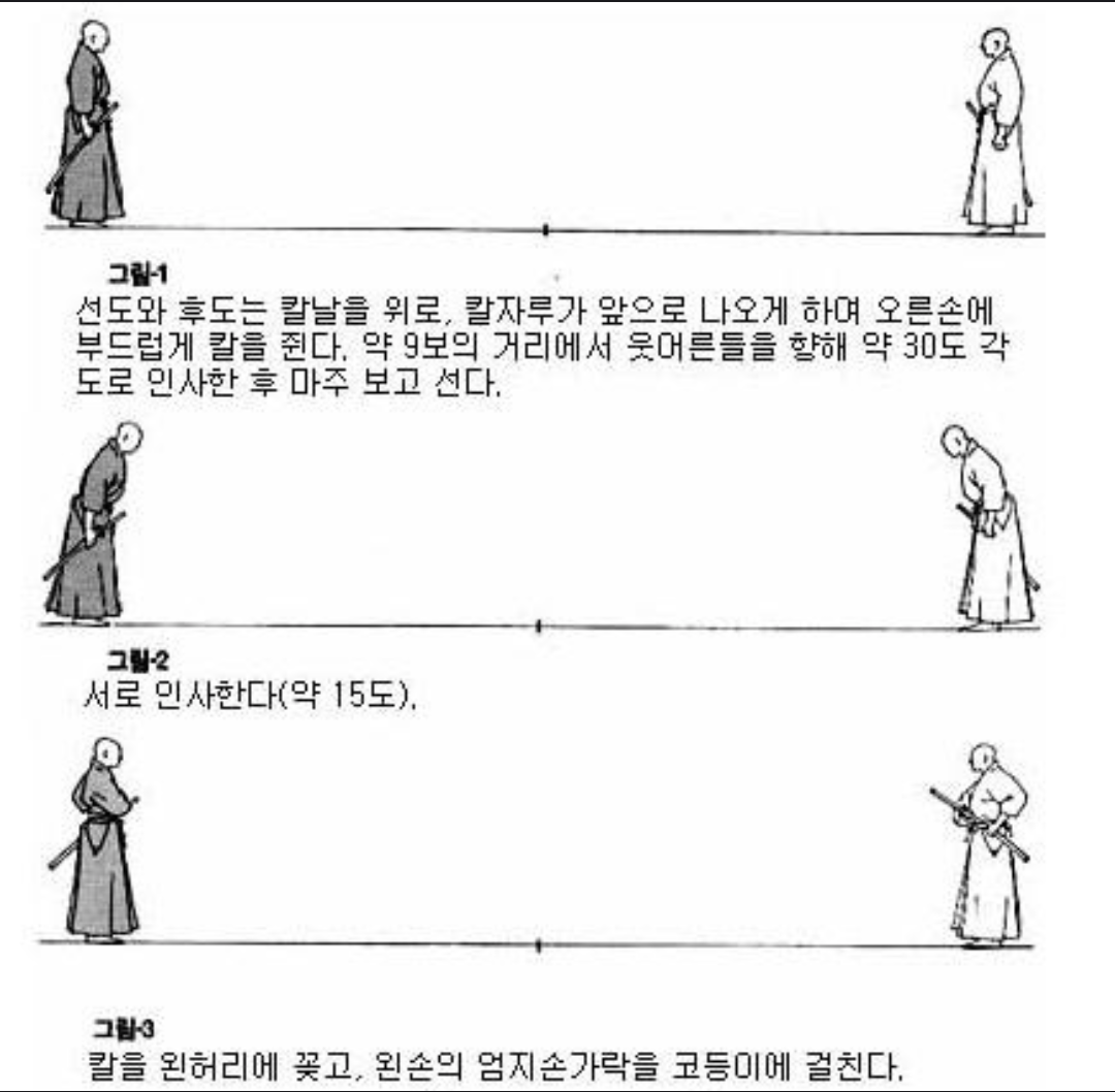 - 본부석을 향해 인사(약30도)한 후, 상호 간 인사(약15도)하고 칼을 허리에 찹니다.