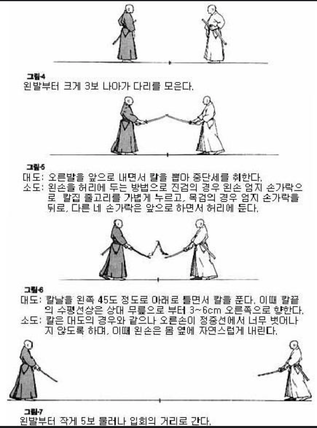- 서로 오른발부터 크게 3보 나아가며 중앙에서 칼을 뽑아 중단세를 취합니다.