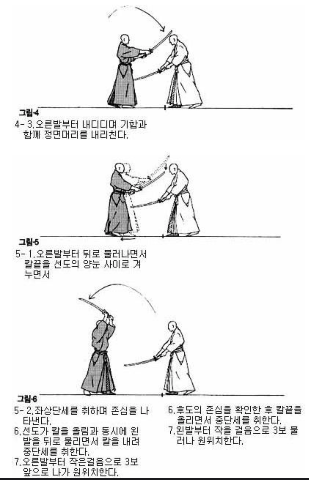 4,5,6번 : 선도가 1보 물러나면 칼끝을 즉시 내리며 선도의 두 눈 사이를 겨누어 잔심을 취합니다.